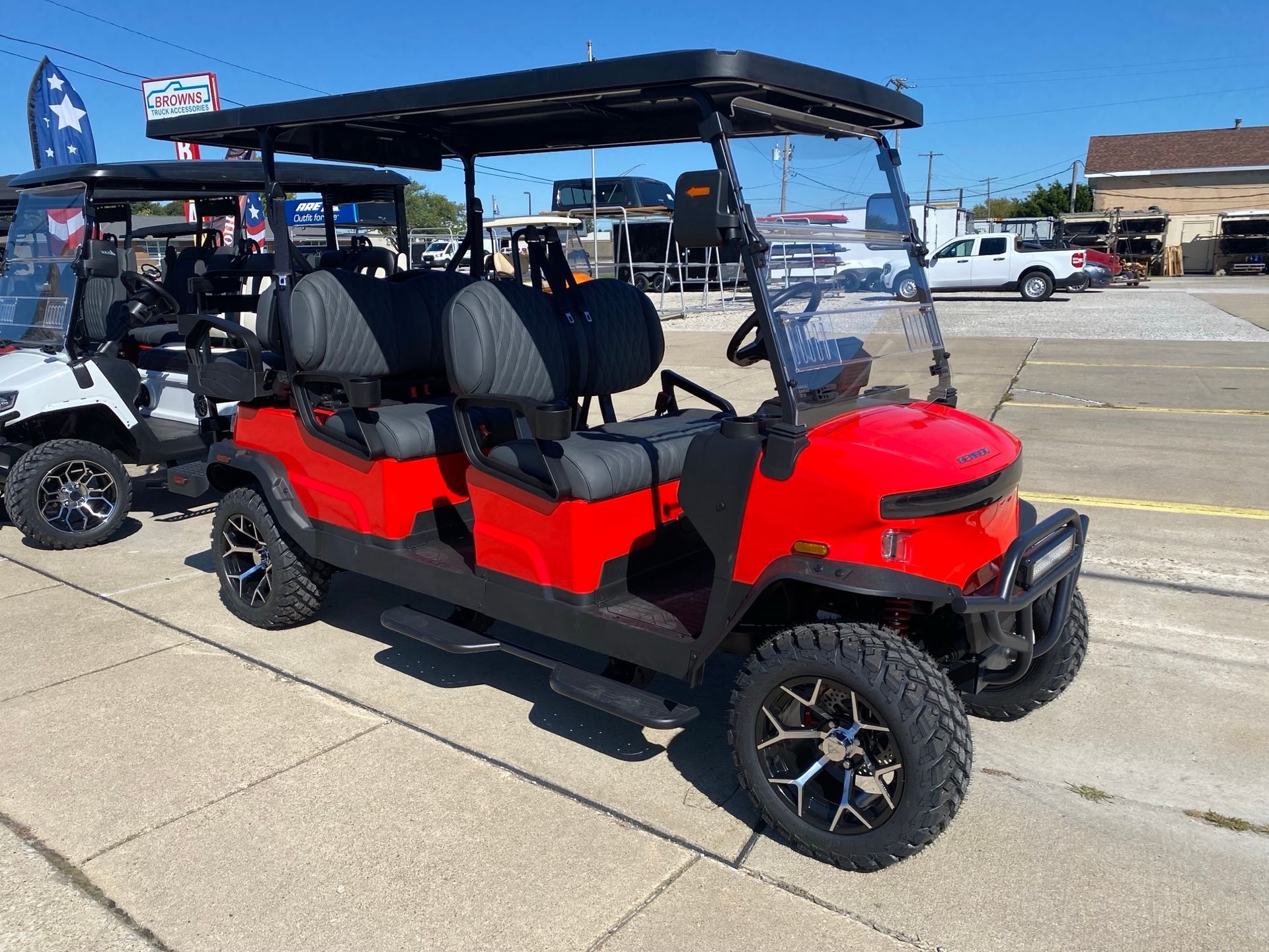 Cruise the neighborhood in style! All New carts are Street Legal with Lights, turn signals, horn, seat belts back up camera, disc brakes and radial tires. Fast and Quiet, new Denago and Evolution Electric vehicles have a Lithium battery with 8 Year warranty. Get to the ball game, golf course or work quickly and safely with a New Evolution golf cart from Brown's Truck Accessories in Forsyth, IL.